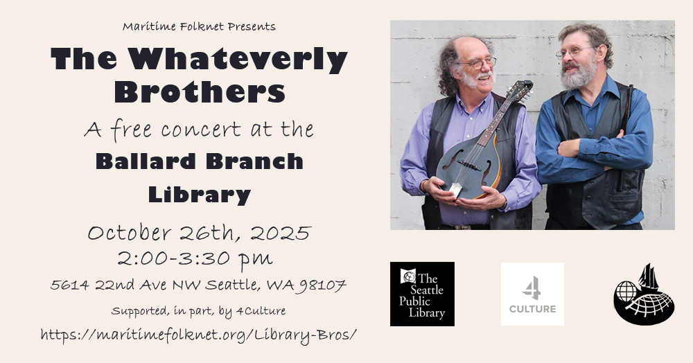 Drawing from a rich and varied musical history, The Whateverly Brothers harken to the folksinger tradition that “No musical style is sacred.” Multi-instrumentalists, they blend guitar, cittern, whistles, and vocal harmonies to weave maritime songs that will resonate with anyone. Hoist anchor and sing along!